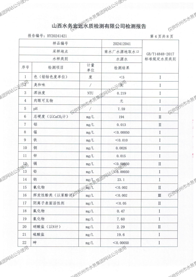 忻州城區(qū)公共供水水源水、出廠水、管網(wǎng)水、管網(wǎng)末梢水2024年12月份水質(zhì)信息公示