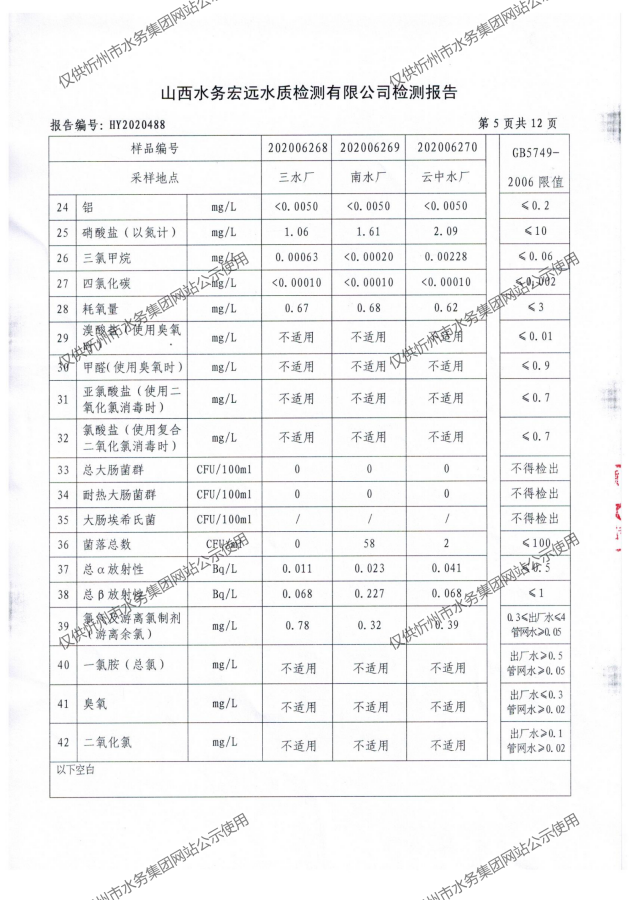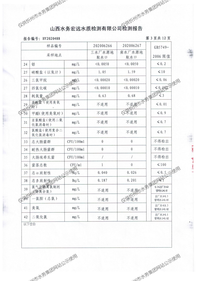 忻州城區(qū)公共供水水源水、出廠水、管網水、管網末梢水2020年7月份水質信息公示