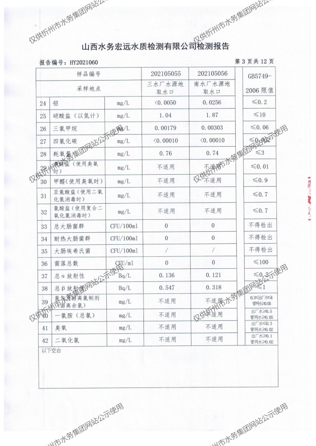 忻州城區(qū)公共供水水源水、出廠水、管網水、管網末梢水2021年5月份水質信息公示
