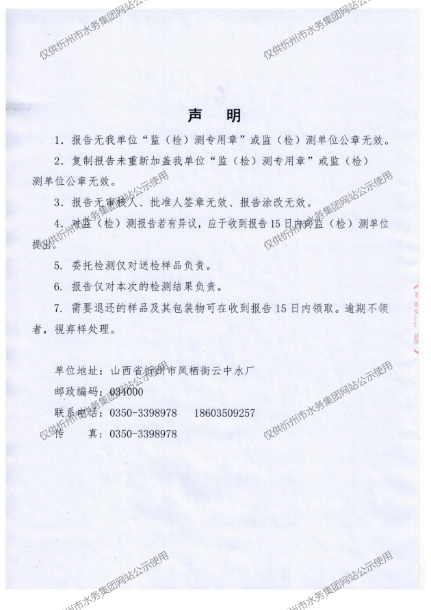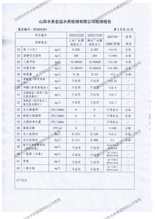 忻州城區(qū)公共供水水源水、出廠水、管網(wǎng)水、管網(wǎng)末梢水2022年12月份水質信息公示