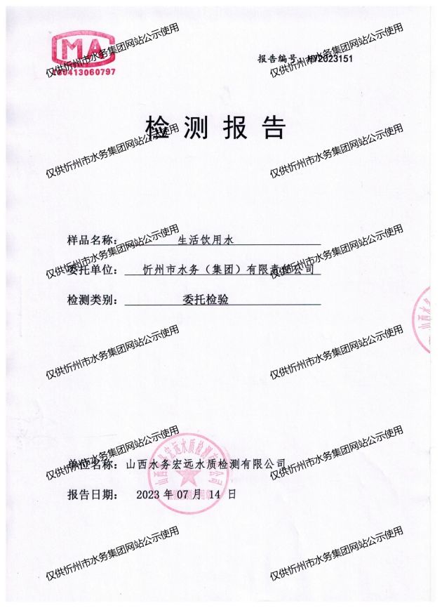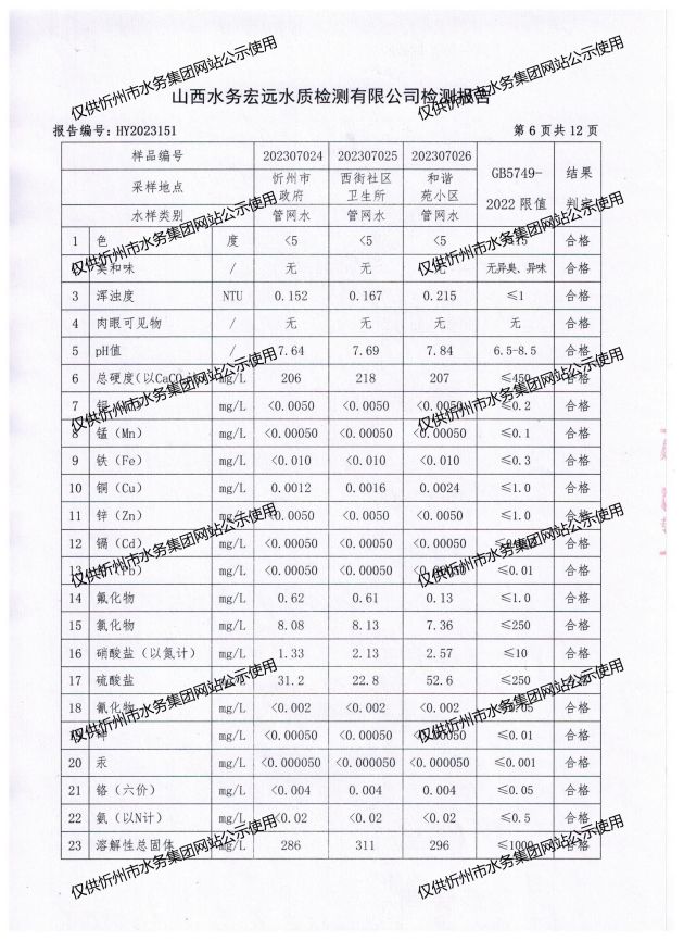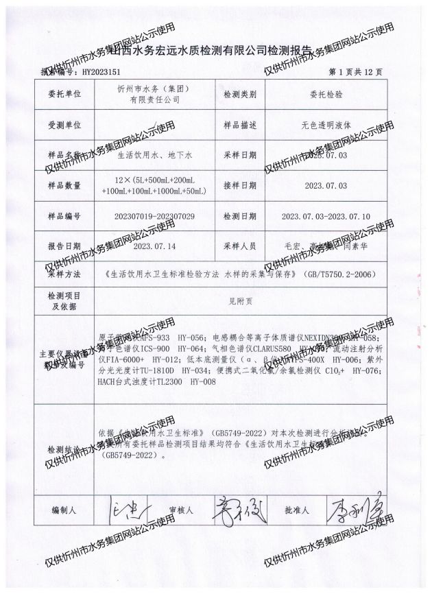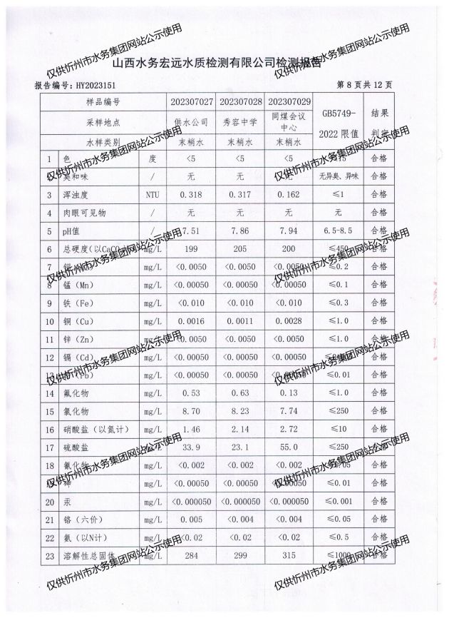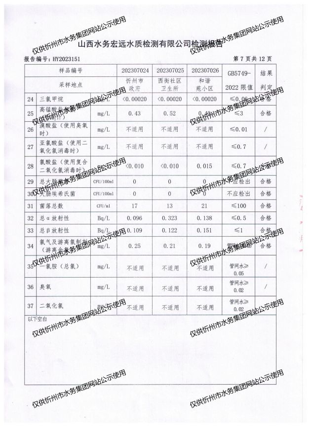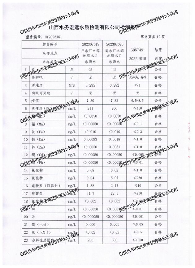 忻州城區(qū)公共供水水源水、出廠水、管網水、管網末梢水2023年7月份水質信息公示