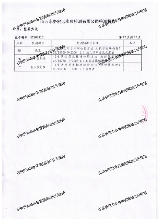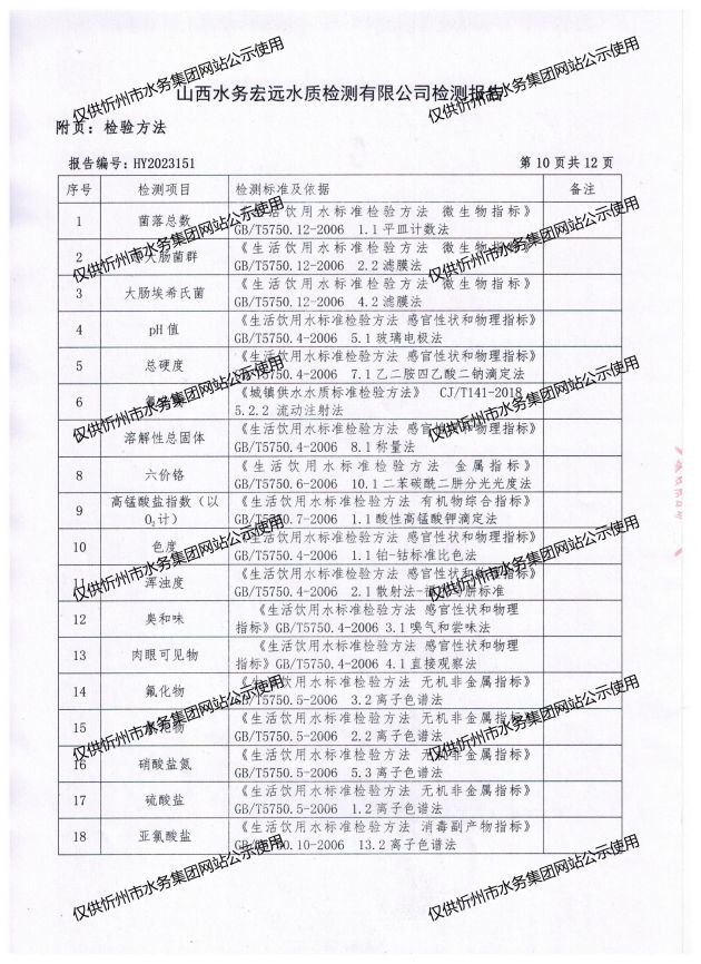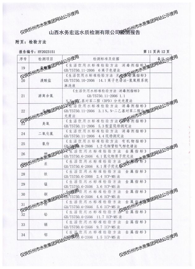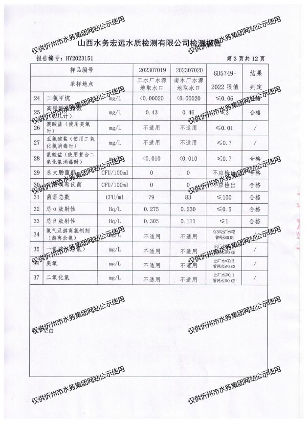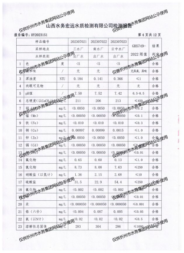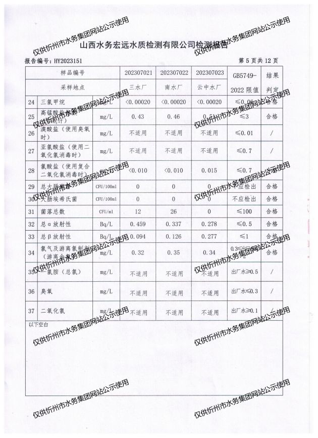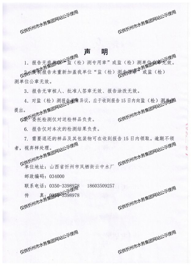 忻州城區(qū)公共供水水源水、出廠水、管網水、管網末梢水2023年7月份水質信息公示