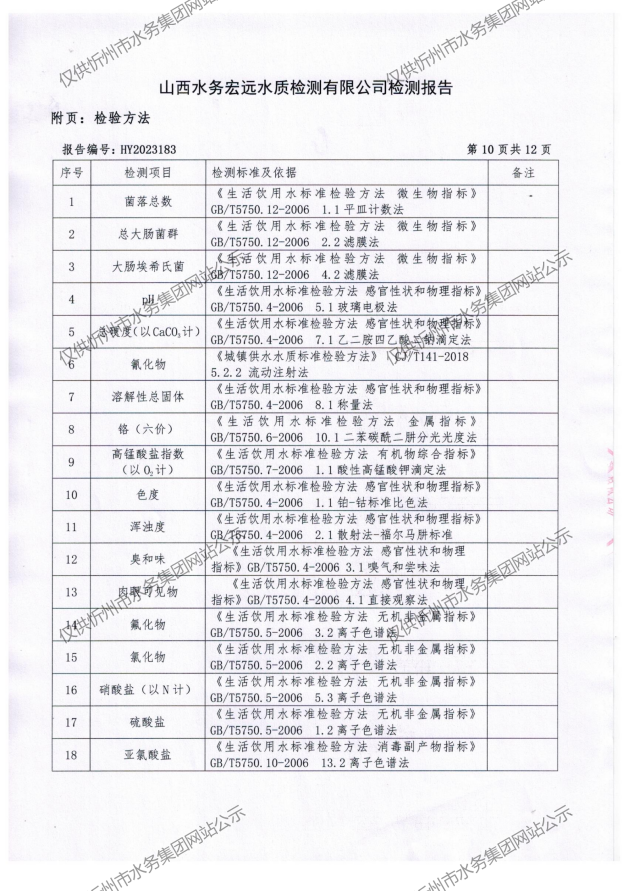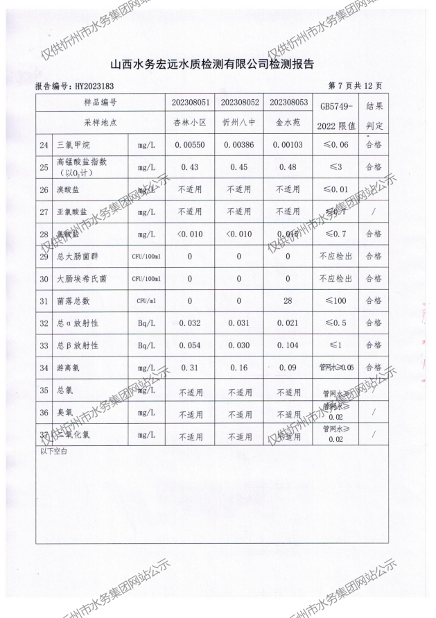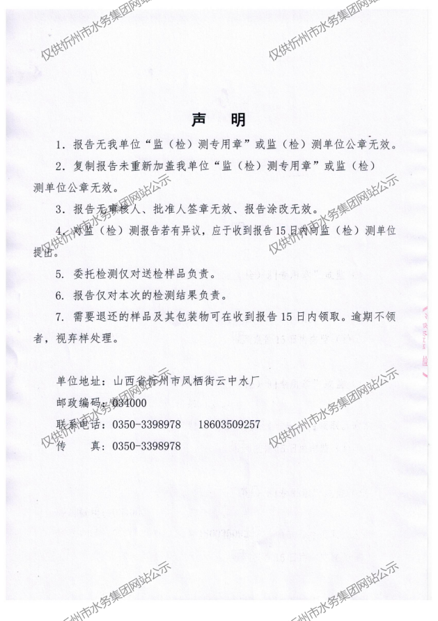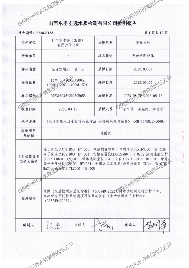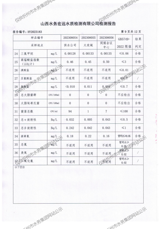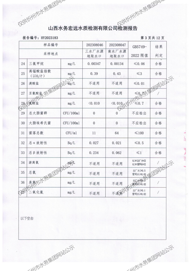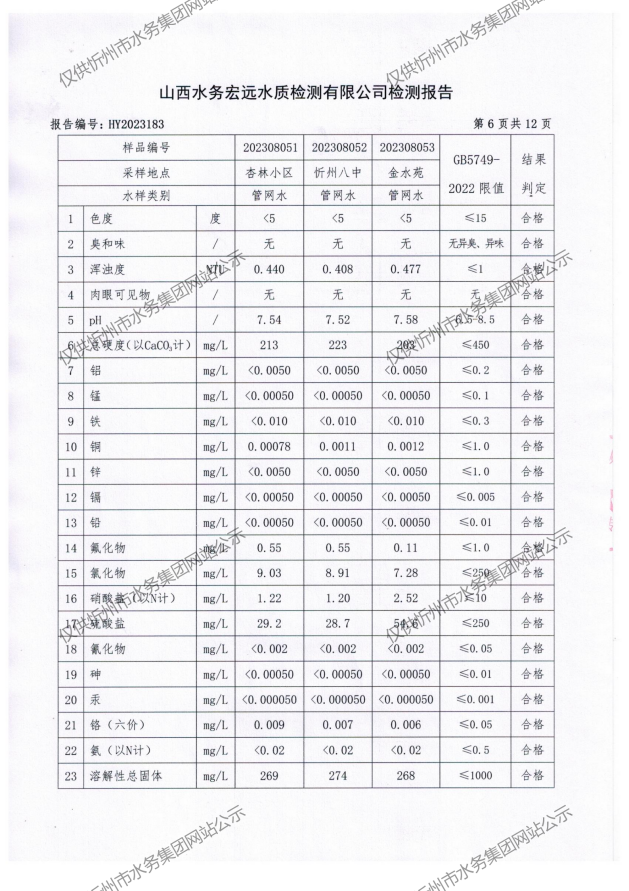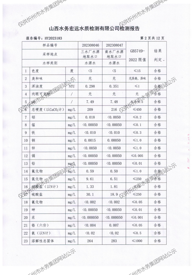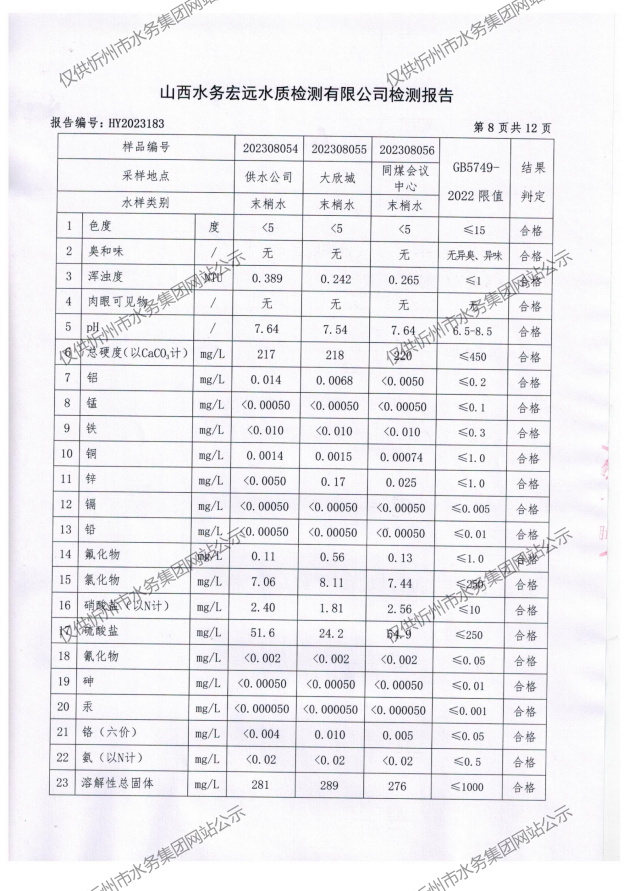 忻州城區(qū)公共供水水源水、出廠水、管網(wǎng)水、管網(wǎng)末梢水2023年8月份水質信息公示